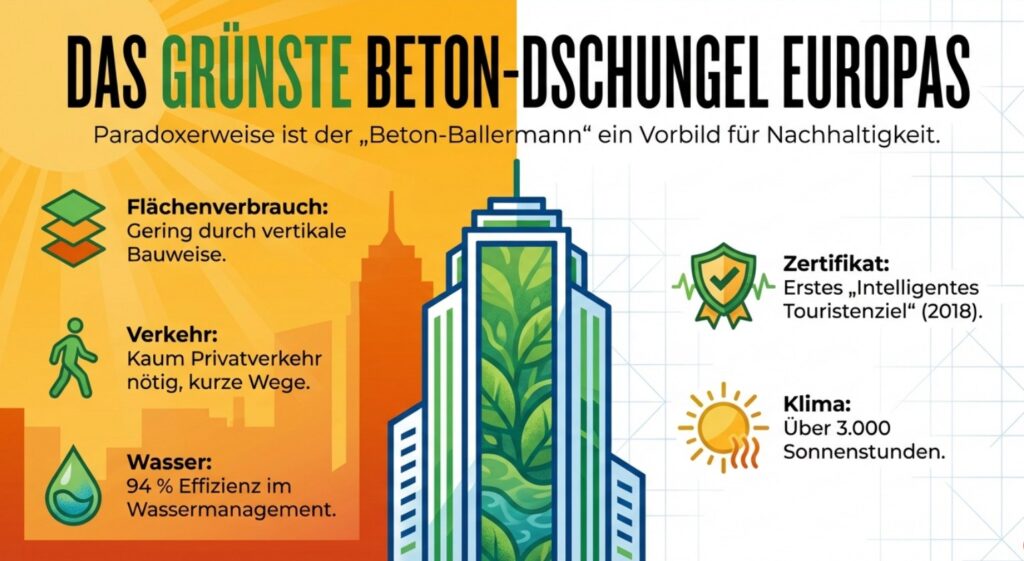 Der vielleicht überraschendste Fun Fact kommt zum Schluss. Trotz seines Rufs als Beton-Ballermann gilt Benidorm unter Stadtplanern als eines der nachhaltigsten Tourismusmodelle der spanischen Küste. Die vertikale Bauweise bedeutet weniger Flächenverbrauch und kürzere Wege. Privatverkehr spielt kaum eine Rolle. Die Stadt erreicht 94 Prozent Effizienz im Wassermanagement und erhielt 2018 als weltweit erste die Zertifizierung als „Intelligentes Touristenziel”. Dazu über 3.000 Sonnenstunden pro Jahr – ein Klima, das die Weltgesundheitsorganisation bereits 1986 als eines der günstigsten der Welt einstufte.