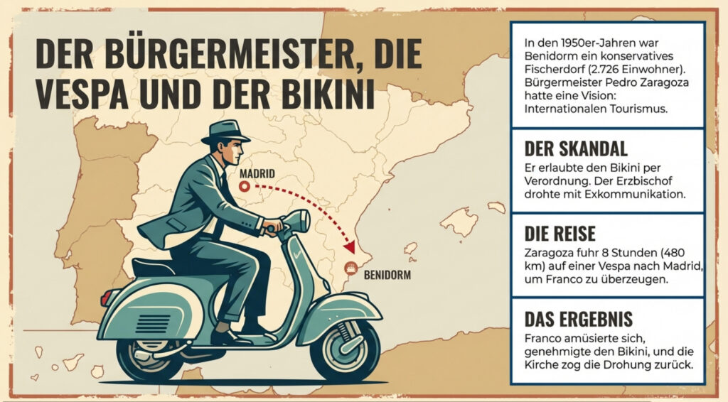 In den 1950er-Jahren zählte Benidorm gerade einmal 2.726 Einwohner und lebte vom Thunfischfang. Dann kam Pedro Zaragoza. Der Bürgermeister hatte eine Vision: internationaler Tourismus. Sein Problem: Francos Spanien war erzkatholisch, und ausländische Touristinnen trugen Bikini. Zaragoza tat, was kein anderer Bürgermeister wagte – er erlaubte den Zweiteiler per Verordnung. Der Erzbischof von Valencia tobte und leitete prompt ein Exkommunikationsverfahren ein.