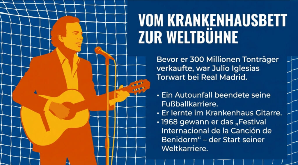 Bevor er über 300 Millionen Tonträger verkaufte, war Julio Iglesias ein 25-jähriger Ex-Torwart von Real Madrid, dessen Fußballkarriere durch einen Autounfall beendet worden war. Im Krankenhausbett lernte er Gitarre spielen. 1968 gewann er das Festival Internacional de la Canción de Benidorm – der Startschuss für eine der erfolgreichsten Musikkarrieren der Geschichte. Das Festival lebt seit 2021 als Benidorm Fest wieder auf und bestimmt heute Spaniens Beitrag zum Eurovision Song Contest.