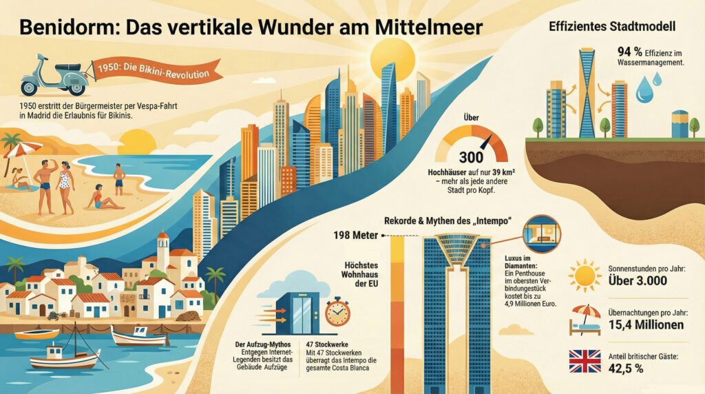 Wer zum ersten Mal nach Benidorm kommt, reibt sich die Augen. Da steht man an der Costa Blanca, erwartet weiße Dörfer und Orangenhaine – und blickt auf eine Skyline, die an Manhattan erinnert. Über 300 Hochhäuser ragen in den Himmel, gekrönt vom Intempo, einem 198 Meter hohen Doppelturm mit diamantförmiger Verbindung. Wie wurde aus einem verschlafenen Fischernest die vertikalste Stadt Europas?