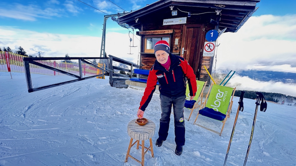 Am Rossfeld etwa bewacht Liftbetreiber Schorsch von seiner Hütte an der Bergstation des Sessellifts aus das bunte Treiben auf den roten und blauen Pisten. Auf einem Hocker vor der Hütte steht eine Schale mit Gummibärchen – für kleine und große Kinder. “Wir sind ein richtig schönes Skigebiet für Familien. Nicht nur was die Pisten betrifft, sondern auch die Preise”, sagt er. Die Tageskarte für Erwachsene kostet 28 Euro – ein unschlagbares Preis-Leistungs-Verhältnis im Vergleich zu größeren Skigebieten. Eltern können den Nachwuchs von der Hüttenterrasse aus beim Skifahren beobachten.