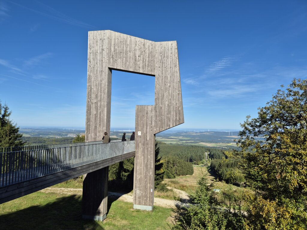 Ein Höhepunkt im wahrsten Sinne des Wortes ist die Skulptur „Windklang“ auf dem Gipfel des Erbeskopfs – Wahrzeichen und Sinnbild für das harmonische Miteinander von Mensch und Natur, wenn der Mensch sich zurücknimmt. Der Aussichtspunkt ist über einen Steg erreichbar und bietet einen weiten Blick über die Hügel des Hunsrücks, auf denen Windräder an die Verantwortung der Klima- und Energiewende erinnern. Je nachdem, wie der Wind durch die Holz-Metall-Konstruktion pfeift, macht der „Windklang“ seinem Namen Ehre. Die Plattform dient außerdem als Trauzimmer des Standesamts Thalfang am Erbeskopf.