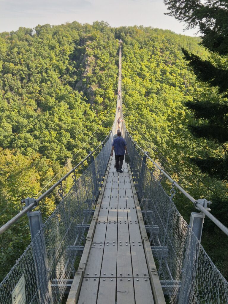 Wer einen größeren Adrenalinkick sucht, der sollte die Hängeseilbrücke Geierlay zwischen den Orten Mörsdorf und Sosberg überqueren. Besucher blicken hier in 100 Meter Tiefe. Gästeführerin Sylvia Kunz-Wagner vermittelt Spannendes zur Geschichte des 360 Meter langen Bauwerks, das seit 2015 den Tourismus der Region kräftig belebt, Einnahmen etwa durch Parkgebühren generiert und Arbeitsplätze geschaffen hat. Sie führt Besucherinnen und Besucher nicht nur auf der mittelschweren Geierlayschleife (6,4 Kilometer, 259 Meter Auf- und Abstieg) ab dem Besucherzentrum Mörsdorf (Kastellauner Straße 23), sondern bietet Erlebnistouren an, etwa am dritten Advent mit Glühwein bei Lichterglanz (Anmeldung: Telefon 06762/9034080, 20 Euro pro Person).