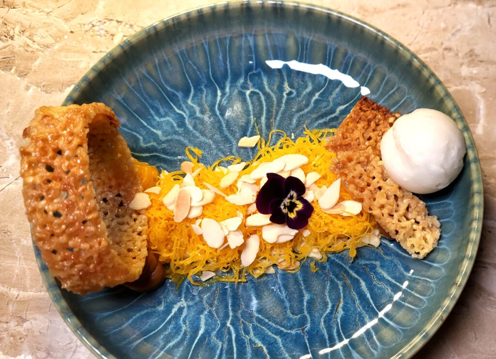 Nicht minder überzeugend ist der Tintenfisch in luftig-knuspriger Tempura, dessen feine Kruste von der cremigen Tiefe einer fermentierten Mayonnaise elegant ausbalanciert wird. Den Höhepunkt markiert der Wolfsbarsch in Salzkruste, den Gabriel am Tisch mit sicherer Hand tranchiert – ein Moment, in dem Präzision, Produktqualität und mediterrane Leichtigkeit eindrucksvoll zusammenfinden.