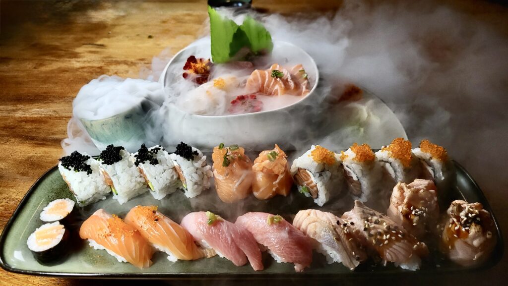 Die Küche setzt konsequent auf erstklassige Produkte und kompromisslose Frische. Wagyu-Nigiri mit Chimichurri überzeugt durch seine butterzarte Textur, während Sashimi-Kreationen wie Lachs mit Shiso und Masago oder feine Jakobsmuscheln mit Tobiko-Crunch Präzision und Klarheit auf höchstem Niveau zeigen. Als kulinarischer Höhepunkt erweist sich das perfekt gegrillte, exquisit marmorierte Dry-Aged-Wagyu – intensiv im Geschmack und meisterhaft auf den Punkt gegart.