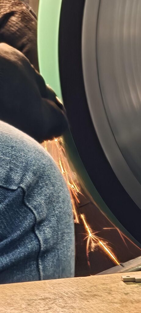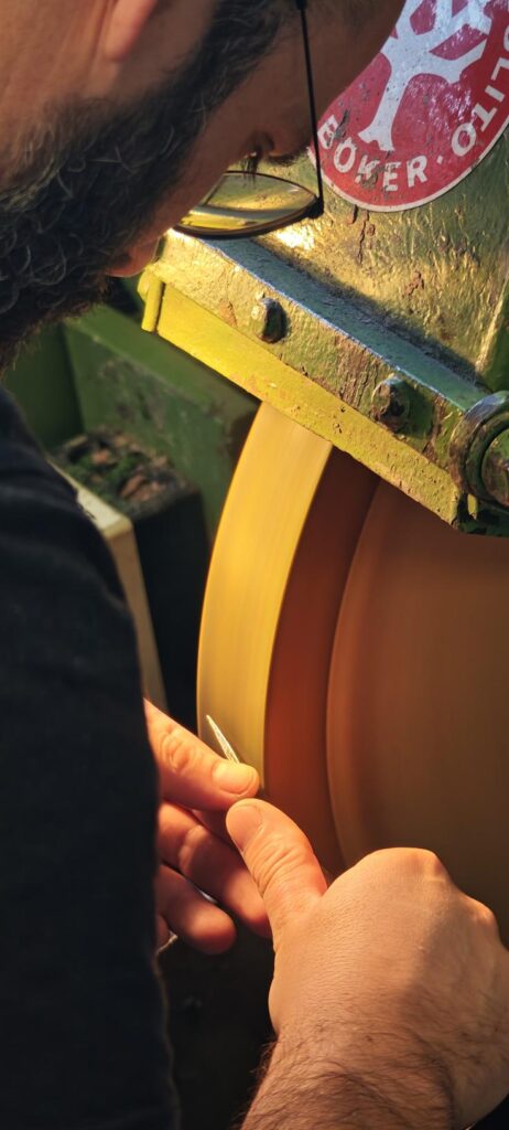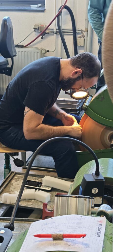 Die Maschinen surren, das Licht der Herbstnachmittags‑Sonne fällt golden durch hohe Fenster – ich gehe weiter und beobachte, wie eine Klinge per Hohlschliff bearbeitet wird: Ein hochpräziser Prozess, bei dem von Hand geschliffen wird, obwohl moderne Technik zur Verfügung steht. Hajo lächelt: „Wir könnten mehr automatisieren – aber wir wollen die Handschrift des Mitarbeiters sehen.“