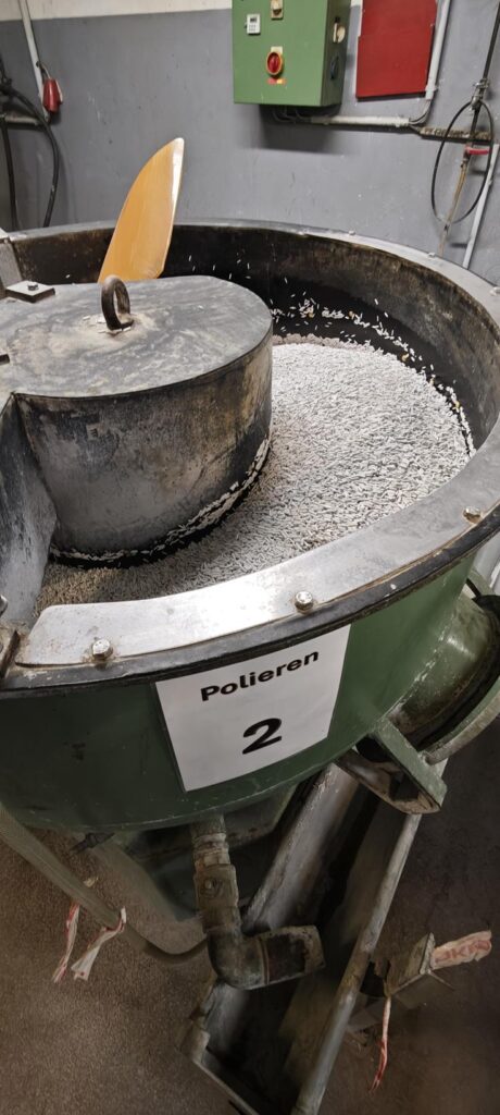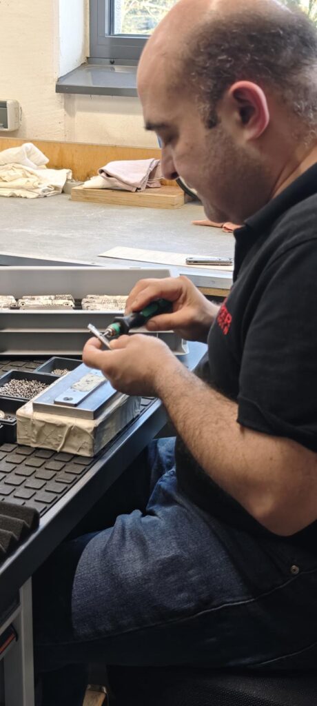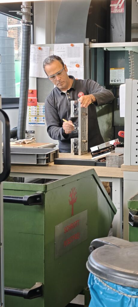 Beim Rundgang zeigt Hajo eine alte Stanzmaschine – sie stanzt Klingen oder Unterlegscheiben, Mitarbeiter füttern sie per Hand mit Material. Die Kombination aus jahrhundertealten Werkzeugen und hochpräziser moderner Technik fasziniert mich: Die Fabrik wirkt trotz industrieller Ausstattung keineswegs kalt – im Gegenteil: Jeder Arbeitsplatz hat das Flair einer Manufaktur.