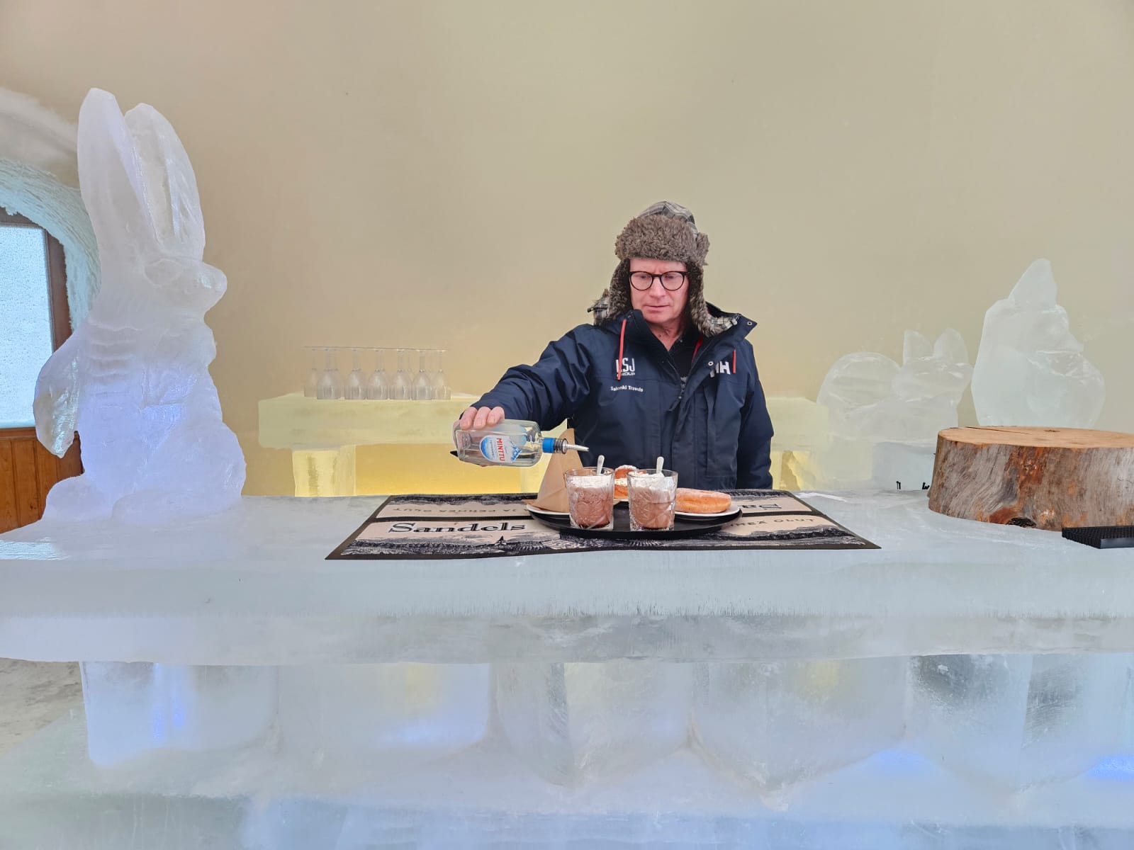 Vielleicht sollte er sofort kommen. Denn im Innenraum knackt es verdächtig. „Keine Sorge“, sagt Vesa, „das Eis arbeitet halt, dann 'redet' es.“ Auch der Glühwein, den Kellnerin Warwara serviert, dürfte keine Gefahr sein. Ebensowenig der heiße Kakao mit dem hochprozentigen Minzschnaps oder die dampfenden Gerichte aus der nebenan liegenden Küche eines weiteren (aus Holz gebauten) Restaurants.