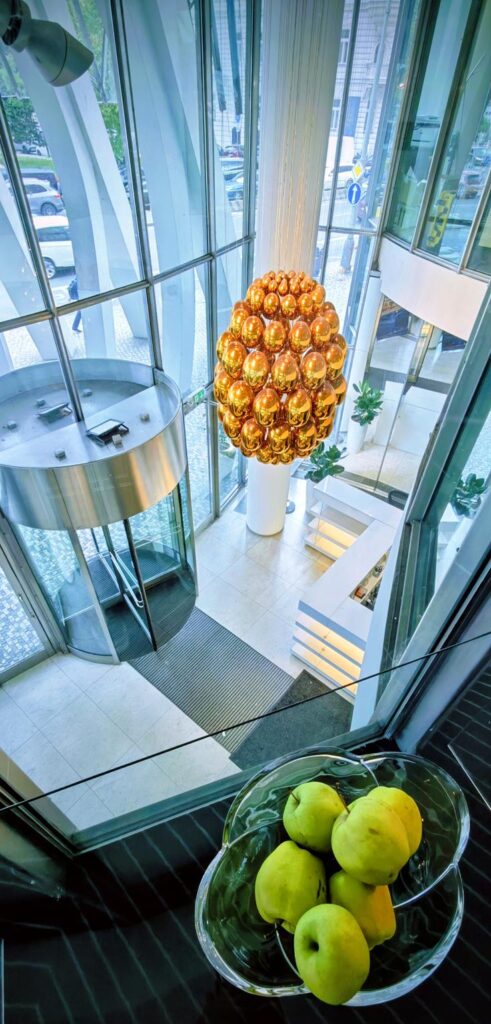 Ein besonderes Highlight ist die Hotelterrasse mit der Glass-Bar, die tagsüber durch ihre Transparenz besticht und nachts im Lichtspiel der Stadt magisch glitzert. Hier sitze ich, die Stadt zu meinen Füßen, und erlebe Prag aus einer ganz neuen Perspektive. Abends erleuchtet das Gebäude selbst in bunten Farben, und innen wie außen scheint das Licht den Tanz der Architektur fortzuführen.