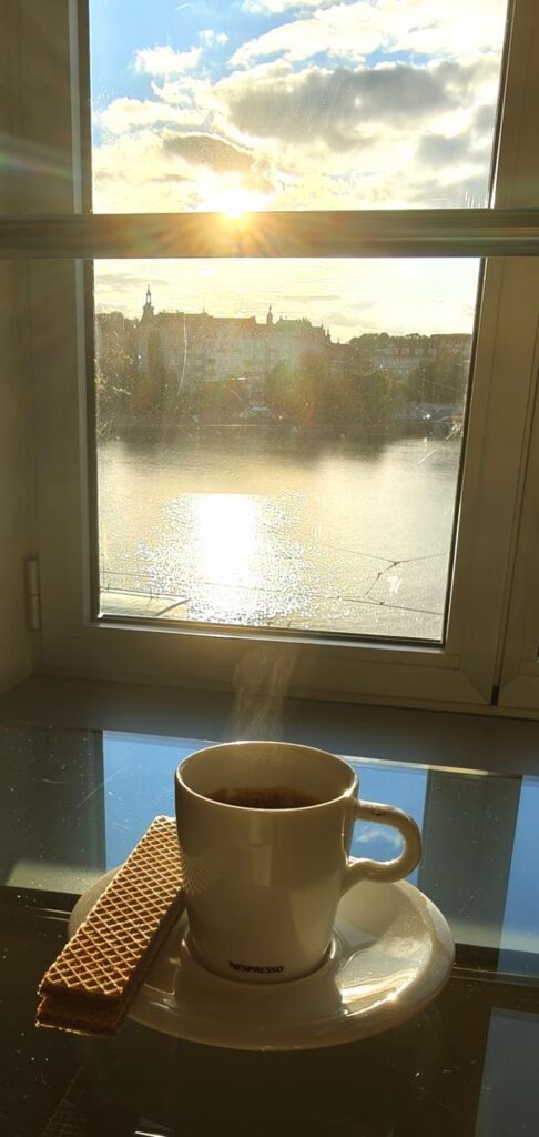 Die Zimmer sind ein architektonisches Abenteuer für sich. In den beiden Türmen, die nach Ginger Rogers und Fred Astaire geformt sind, erwarten mich skurril geformte, runde Räume, die modernes Design, Komfort und Individualität miteinander verbinden. Jeder Blick aus den Fenstern eröffnet neue Perspektiven auf die Moldau, die Altstadt und – überraschend – auf die Weichselburg und den Wawelhügel, deren Silhouetten sich majestätisch in den Fluss spiegeln.