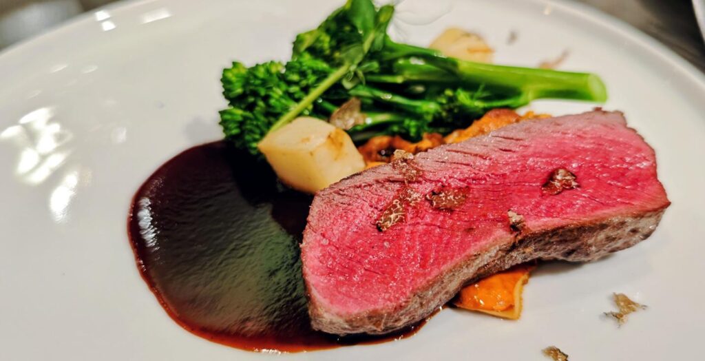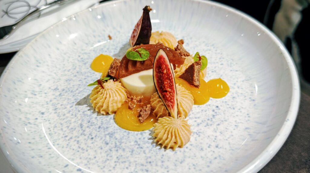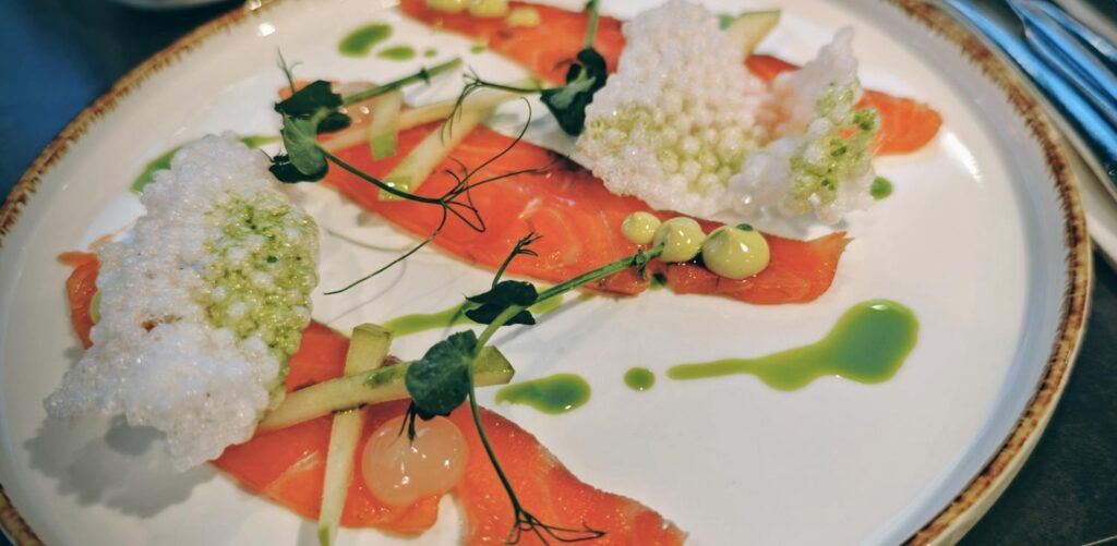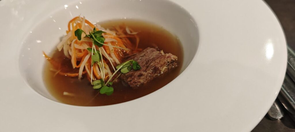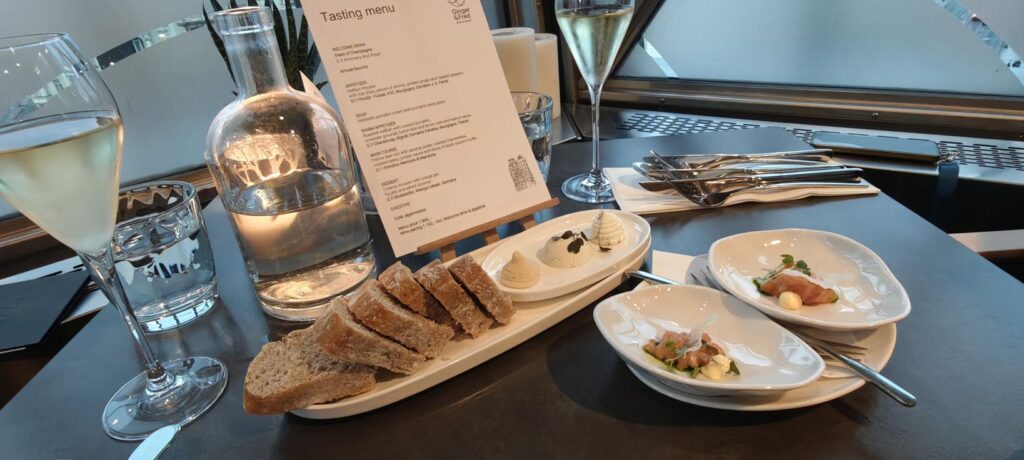 Kulinarisch setzt das Dancing House Hotel Maßstäbe: Im Rooftop-Restaurant genieße ich ein monatlich wechselndes 5-Gänge-Tasting-Menü, das durch eine sorgfältig abgestimmte Weinbegleitung ergänzt wird. Jeder Gang ist ein visuelles und geschmackliches Erlebnis, während der Panoramablick über die Stadt die Sinne zusätzlich stimuliert.