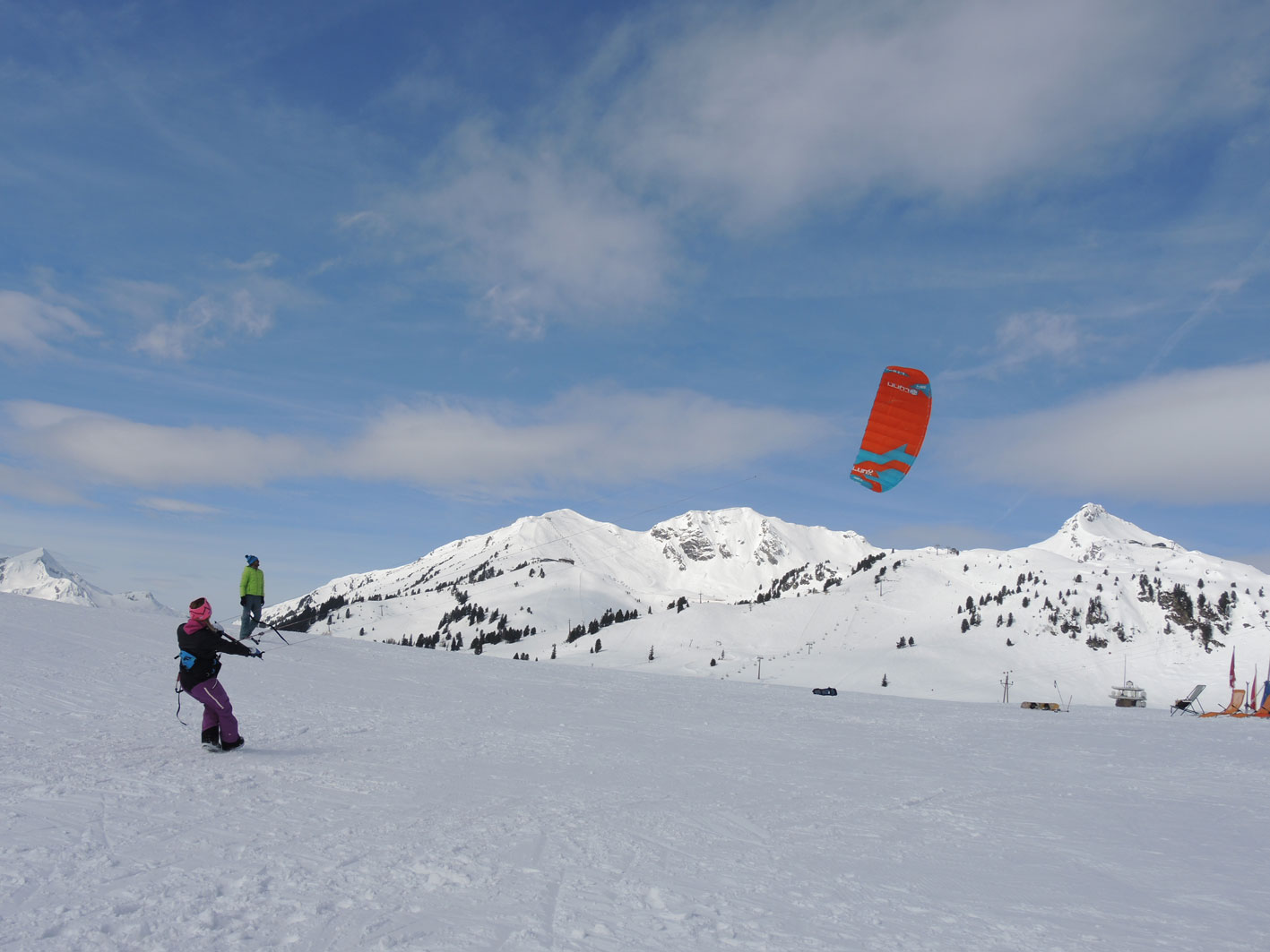 Der Drachen hoch über mir zieht voll Gas nach rechts und – oh nein! er verliert Höhe, geht auf drei Uhr, das bedeutet er bekommt noch mehr Zug. Er zerrt mit aller Kraft an meinem Hüftgurt, ich mache wieder einmal mehrere Sprünge vorwärts. Zum Glück habe ich noch keine Skier an den Füßen. Beim Snowkiten geht es erst einmal nur darum, die Schirmkontrolle zu erlernen. Denn diese macht 90 Prozent des Könnens aus – und davon bin ich weit entfernt, noch fliegt der Drachen mit mir.