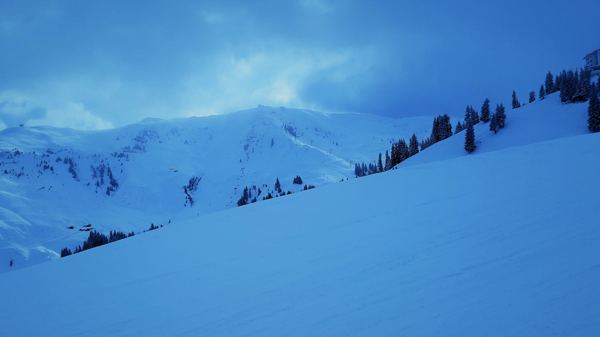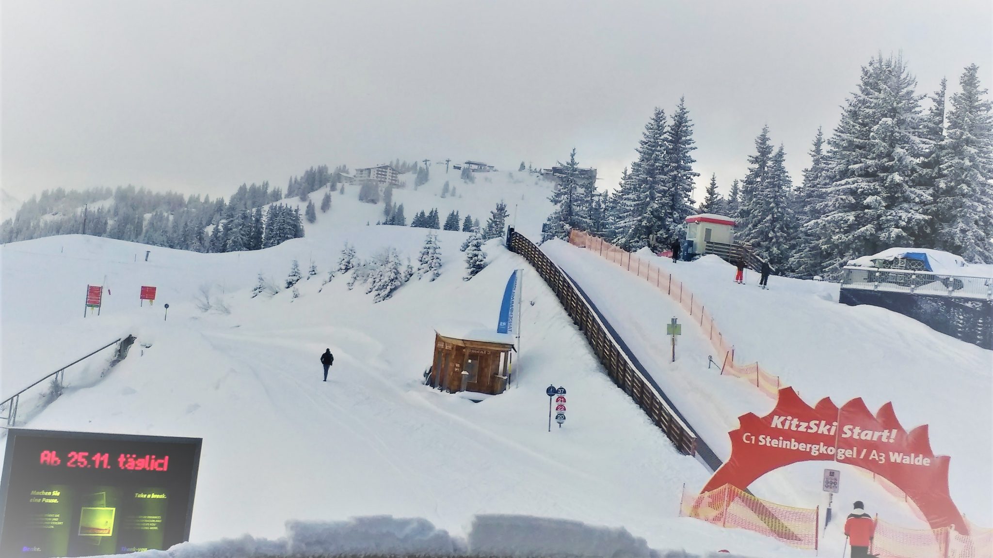 Bei 50 cm frischem Neuschnee und Schneegestöber transportiert uns der Märchenlift direkt zum Starthaus der Streif.