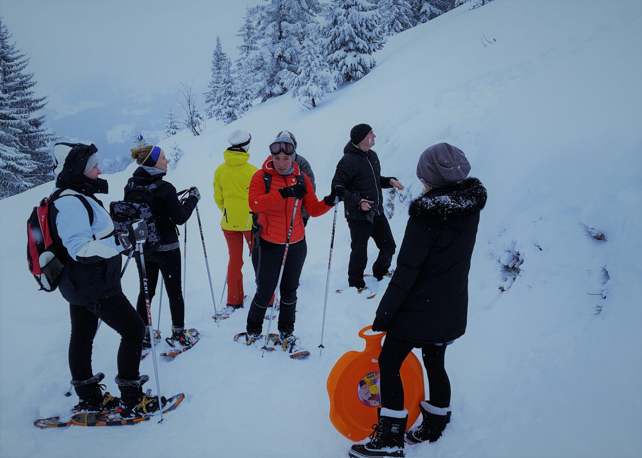 Mittlerweile ist es richtig zapfig geworten. Eisiger Wind pfeift auf 1.600 Metern Höhe, der Schneefall hat zugenommen. So könnte es auf einer Polar-Expedition sein. Nur noch 40 Minuten, versprechen uns Bettina und Dorle vom Fremdenverkehrsverein. Zwischen Fleckalm und Hahnenkammbahn gelegen, erreichen wir auf Schneeschuhen querfeldein stapfend , die mit Schindeln gezierte urige Hütte auf 1.750 Metern Höhe. Im Sommer dürfte der Blick auf das bezaubernde Bergpanorama sehenswert sein. Jetzt heißt es nur, rein in die warme Stube und bei traditionellen Schmankerln tiroler Gastfreundschaft genießen und die kalten Füße enteisen.