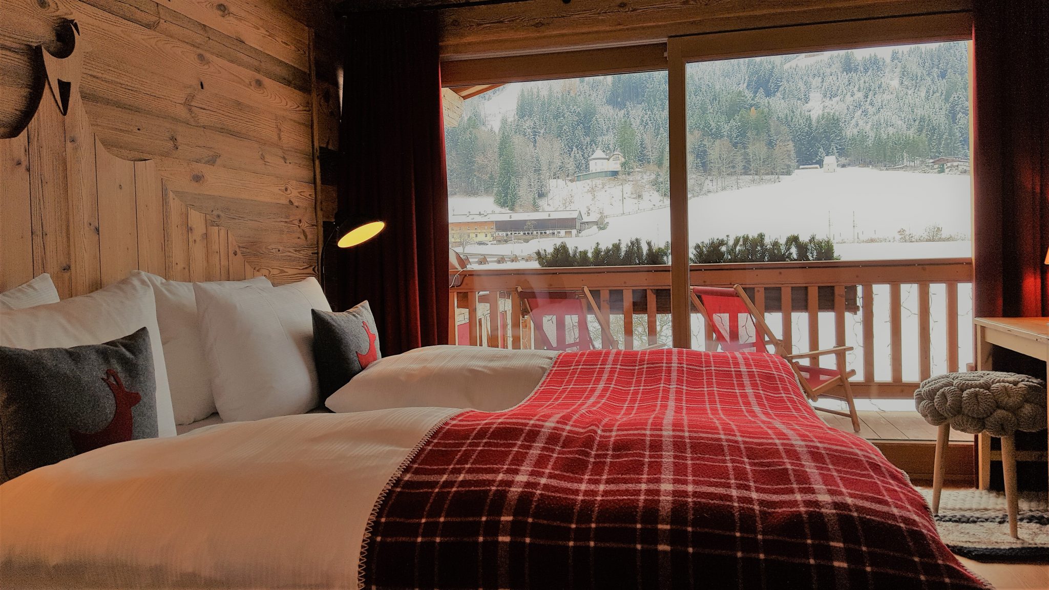 Durch die Wahl der verarbeiteten Materialien bleibt trotz moderner Geradlinigkeit die Tradition immer präsent. Das gilt für die Fußböden aus Gebirgslärchenholz wie für den grauen und roten Loden der eleganten Möbel. Schwarzweiß-Fotografien von der „guten alten Zeit“ zieren die Wände. Sehr cool: immer wieder der Blick durch bodentiefe Fenster oder Glasfronten. Sogar von manchen Zimmern, wie zum Beispiel den Suiten im Dachgeschoß – auf das Kitzbüheler Horn und den Hahnenkamm. Apropos Suiten: Die sind nicht nur unterschiedlich gestaltet, sie bieten auch Luxus mit Loftcharakter und Panoramasicht auf das streifsche Skispektakel im Januar. „Wir möchten unseren Gästen ausreichend Platz und den größtmöglichen Komfort bieten. Deshalb haben wir für unsere Junior-Suiten sogar Räume zusammengelegt und damit unsere Zimmeranzahl etwas reduziert“, erklärt Hoteldirektor Johannes Mitterer.