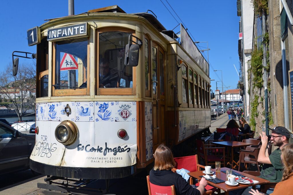 Die alte Straßenbahn in Porto fährt direkt an den Cafés vorbei bis zum Atlantik.