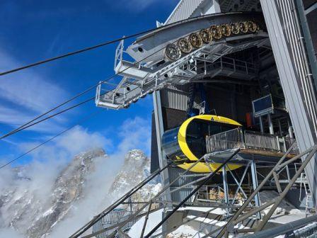 Keine Stunde, sondern nur zehn Minuten dauert die Fahrt mit der Gletscherbahn Dachstein bis zur Bergstation „Energiekristall“. Das Ausblick von der Gondel auf die Bergwelt mit Torstein, Mitterspitz und Hohem Dachstein ist atemberaubend. Noch spektakulärer wird es oben in 2.700 Metern Höhe. Zunächst betrete ich die Aussichtsplattform Sky Walk und genieße bei strahlendem Sonnenschein das Panorama.