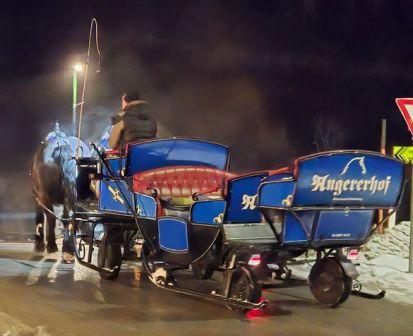 Eine weitere Zuchtspezialität des Bauernhofes sind Noriker-Pferde, wegen ihres schwarzen Hauptes auch Mohrenköpfe genannt. Dem kräftigen und ausdauernden Gebirgskaltblut begegne ich am Abend wieder, als Kutscher Florian Hutegger vom Angererhof mit seinem Pferdeschlitten vorfährt.