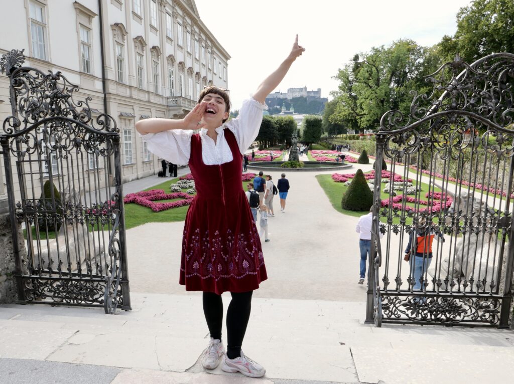 Wir folgen den Spuren der Trapp-Familie also nochmals aus anderer Perspektive und steigen in Salzburg auf´s Fahrrad. Gemeinsam mit Angelika Warmuth treten wir in die Pedale, um die Drehorte in der Stadt an der Salzach zu entdecken. Mit geballter Wadlkraft strampeln wir hinauf zum Stift Nonnberg und erfahren, dass sich Maria und Georg im Kirchlein des weltweit ältesten noch bewohnten Benediktinerinnenklosters das Ja-Wort gegeben haben. Die 29-jährige Würzburgerin, die eigentlich nur zum Studium nach Salzburg gekommen ist, schmunzelt. „Klischee gehört eben dazu“. Deshalb trägt sie auch Dirndl auf ihren Radtouren und gibt an wichtigen Schauplätzen gekonnte Jodeleinlagen zum Besten.