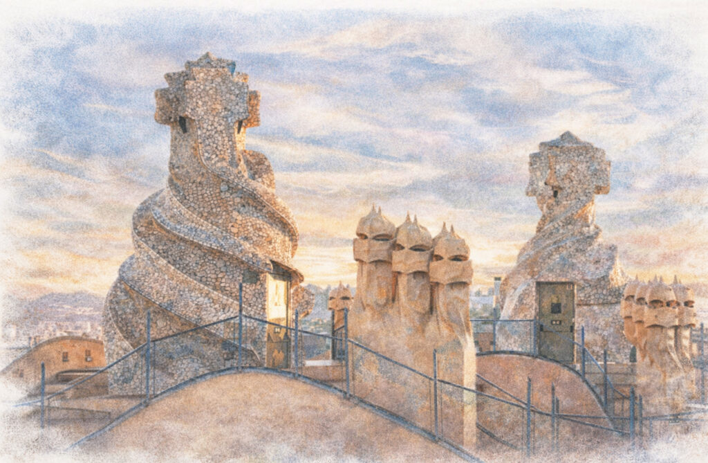 Der eigentliche Magnet ist das Dach. Schornsteine, die wie gepanzerte Ritter in verdrehten Rüstungen aussehen, Belüftungsschächte in spiralförmigen Formen, Treppen-Ausgänge wie Helme. Von hier oben überblickt man das Eixample-Raster Barcelonas – ein Kontrast, der die Seltsamheit des Dachs noch verschärft. Im Sommer bietet La Pedrera Abendveranstaltungen auf dem Dach an, bei denen Jazz gespielt wird. Ein Konzert unter diesen Skulpturen, in der Abendluft über Barcelona, ist eines der merkwürdigsten und schönsten Konzerterlebnisse in Spanien.