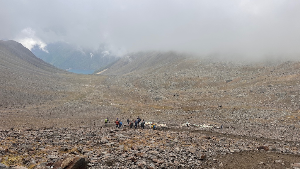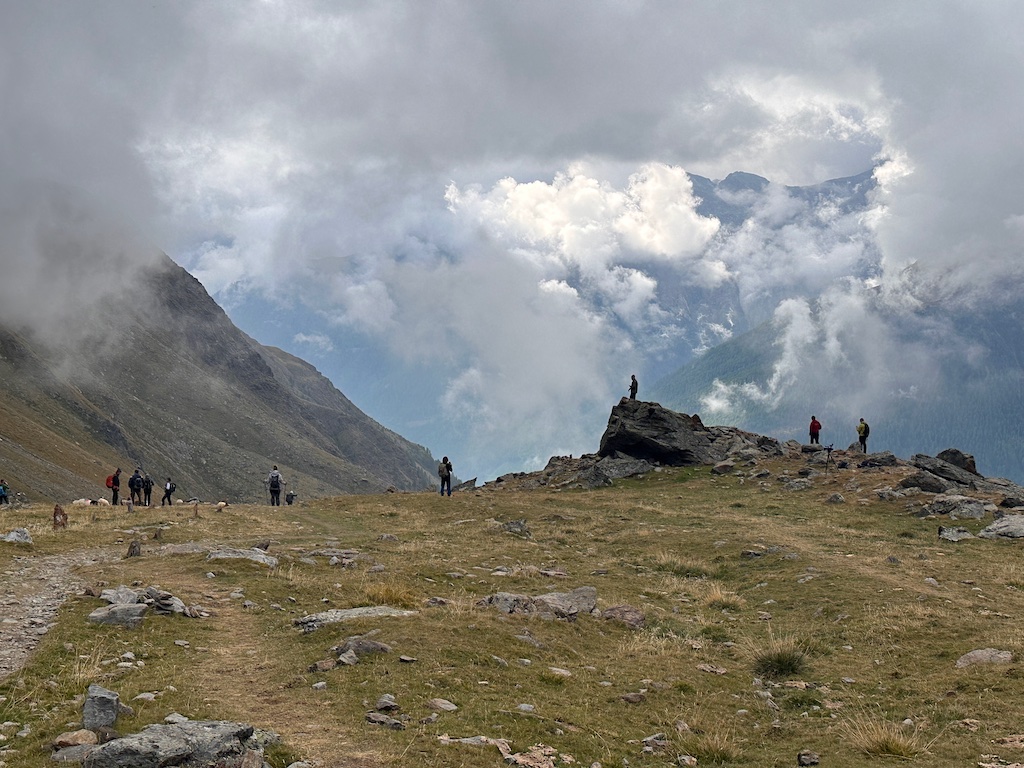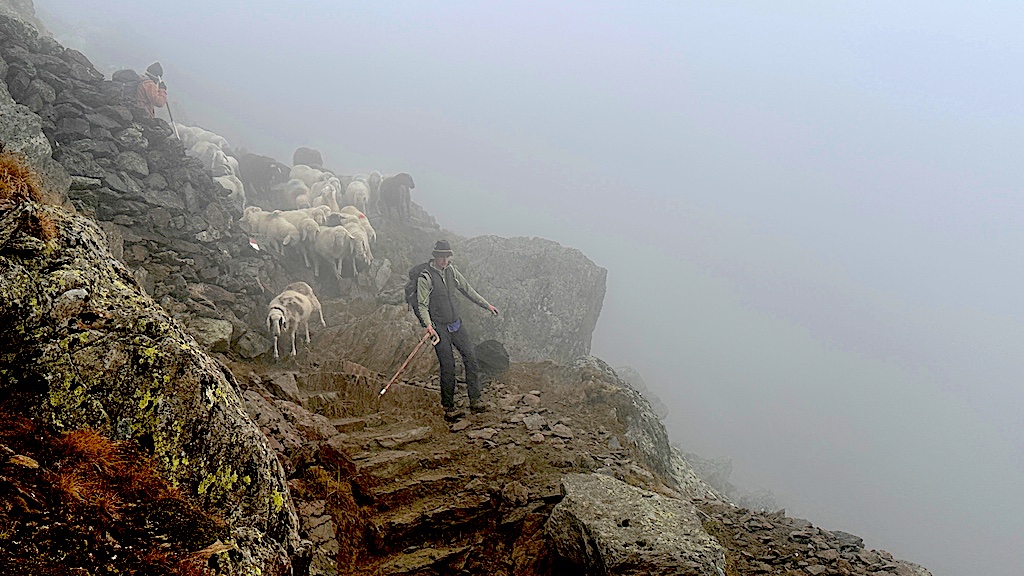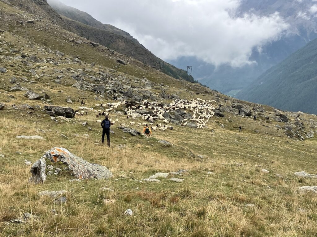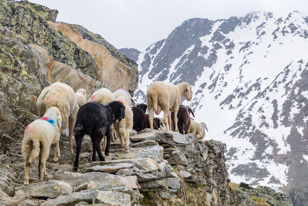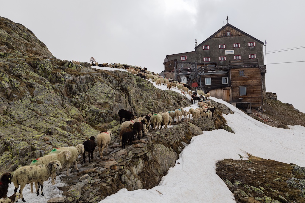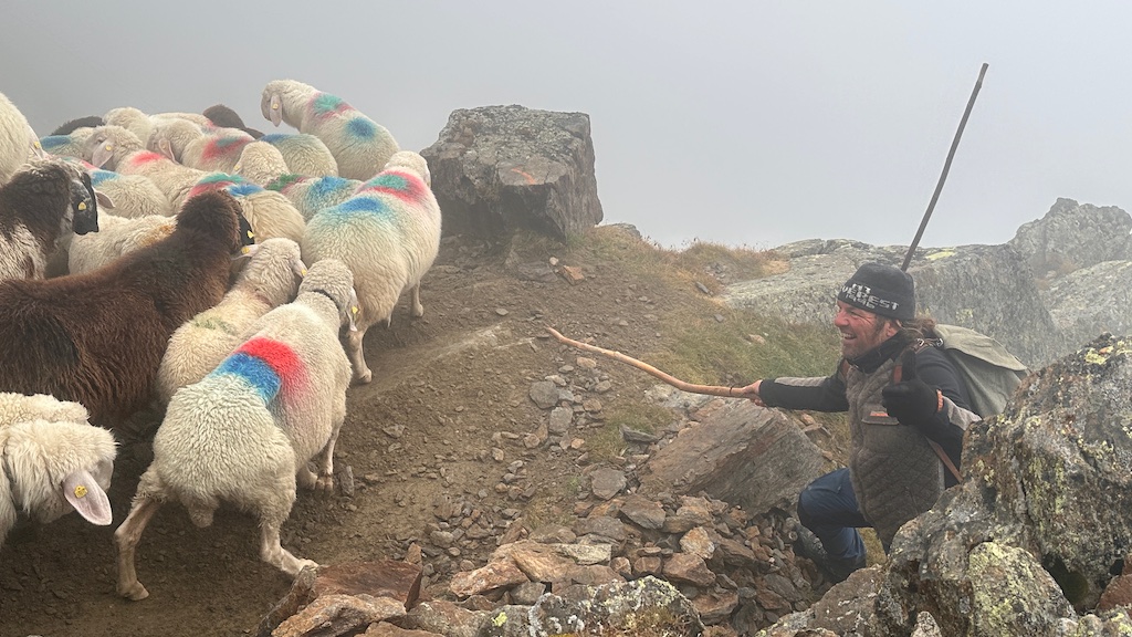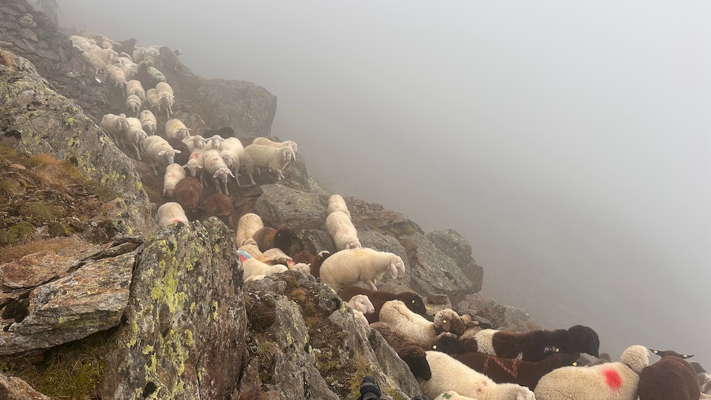 Durch den Rückgang der Gletscher führt der Zug inzwischen auf den Hauptwegen nur noch an Gletschern und Gletscherzonen vorbei, teils über Altschneefelder und Moränen. Sowohl beim Sommerübertrieb im Juni als auch im September kann es hier oben auf über 3000 Höhenmetern auch immer wieder Schnee geben. „Heute waren wir sehr schnell, das Wetter hat einigermaßen gepasst. Durch den Nebel haben wir sie schnell durchtreiben müssen und schauen, dass wir keines verlieren. Schafe sind bisweilen recht störrisch, die haben oft ihren eigenen Plan. Manche Schafe können sogar richtige Aschlöcher sein. Die sind viel schwieriger zu hüten als Kühe, denn sie sind sehr viel wendiger und flinker und springen an Stellen, wo man als Hirte kaum hinterherkommt.“