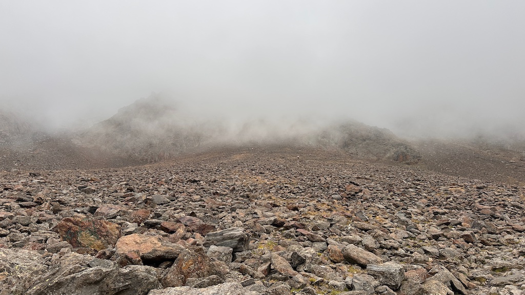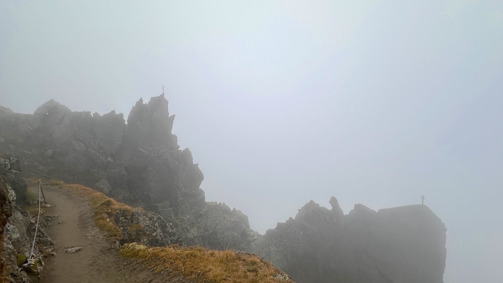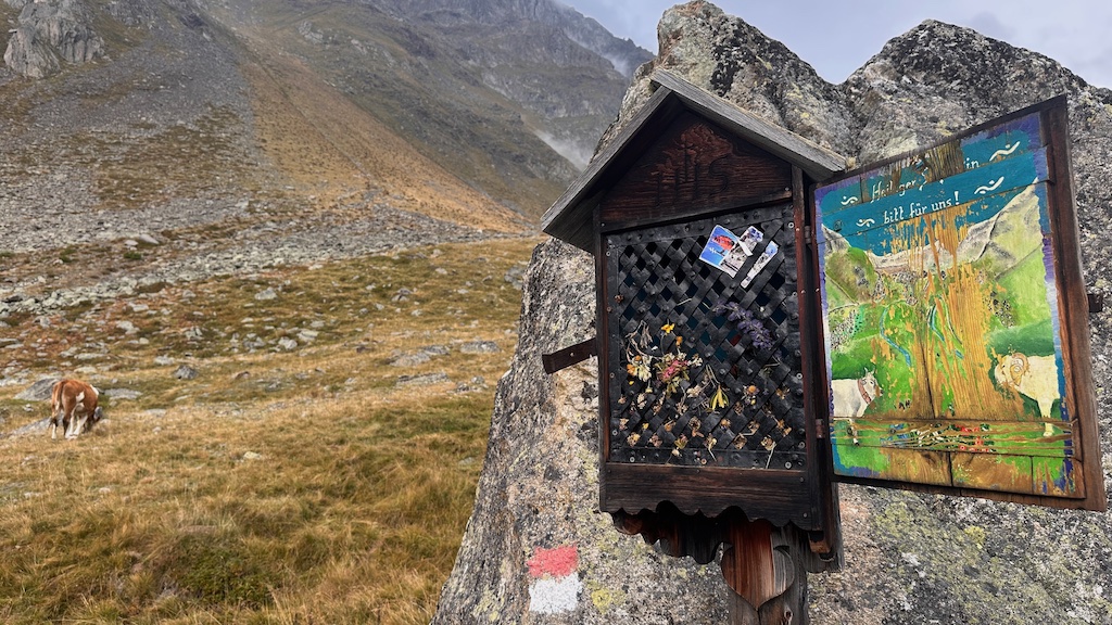 Der inzwischen dichte Nebel verleiht dem Pfad zusätzlich eine mystische Aura. Die Sicht ist eingeschränkt, die Temperatur nahe null Grad. Nur das Knirschen meiner Schritte auf dem steinigen Boden schnarrt durch die Stille. Und irgendwann höre ich sie dann, die Glocken der Herde, die die Hirten der Nähe der Similaunhütte für ihren letzten Weg ins Tal zusammengetrieben haben.