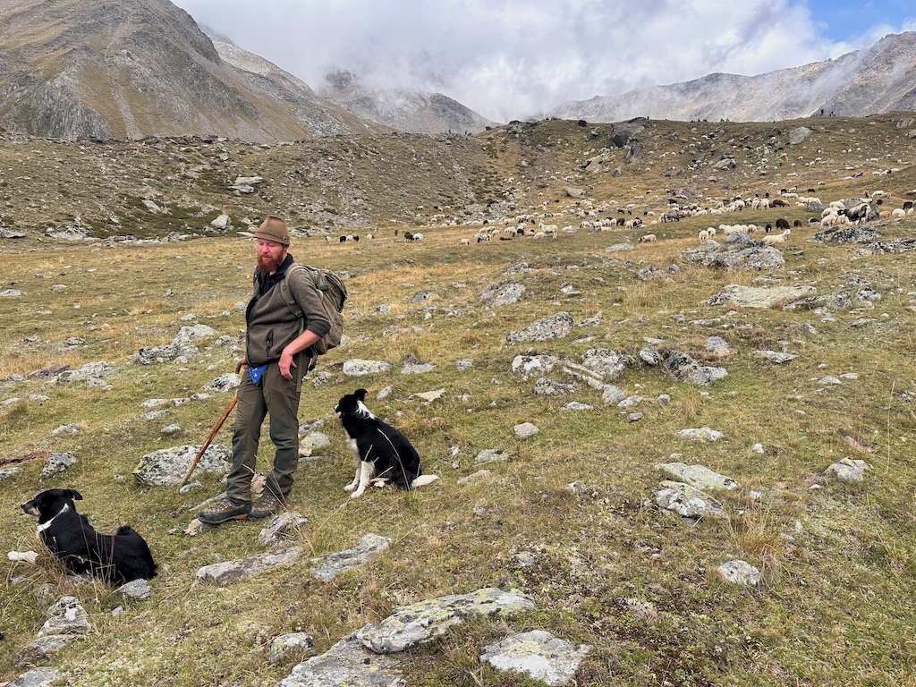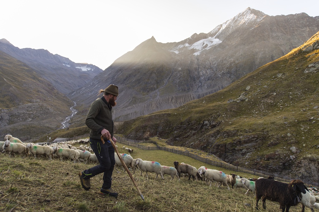 Hier treffe ich auf Manuel Götsch, den obersten der sieben Hirten, die den Sommer über bei den Schafen im Ötztal geblieben sind. Er begrüßt mich mit einem freundlichen Nicken und einem von Wind und Wetter gegerbten Gesicht, das von einem rothaarigen Vollbart umrahmt ist. Auf dem Kopf sitzt kess der typische Schäferhut.