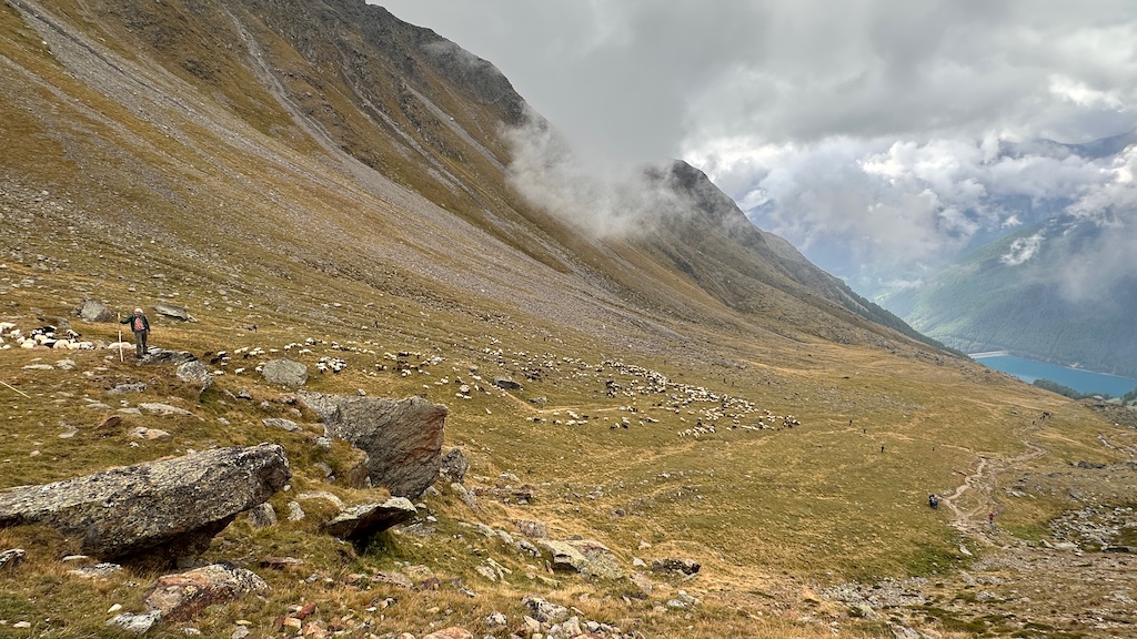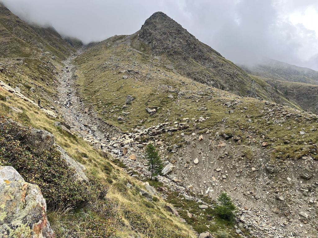 Hin und wieder höre ich das Bimmeln von Kuhglocken. Ansonsten herrscht himmlische Ruhe, während allmählich vom Tal her Nebelwolken heraufziehen und den Blick auf den See verdecken. Heute ist ein besonderer Tag, an dem ich für ein paar Stunden Teil einer jahrtausendealten Tradition werden darf: der Transhumanz. So heißt die 44 Kilometer lange Wechselwanderung der Schafe zwischen ihren Winter- und Sommerquartieren, eine der bedeutendsten kulturellen Traditionen des Schnalstals, wenn nicht des gesamten Alpenraums. Dabei treiben die Schnalser Bauern und ihre Hirten zweimal im Jahr Tausende Schafe (und einige Ziegen) über die Alpen – im Juni auf die Hochweiden bei Vent im österreichischen Ötztal und im September zurück ins Schnalstal. Der Begriff „Transhumanz“ stammt ursprünglich aus dem Lateinischen „trans“ (jenseits, hinüber) und „humus“ (Erde, Boden). Er wurde zudem über das Französische „transhumer“ oder „transhumar“ überliefert, was so viel wie „wandern“ oder „mit Herden wandern“ bedeutet.