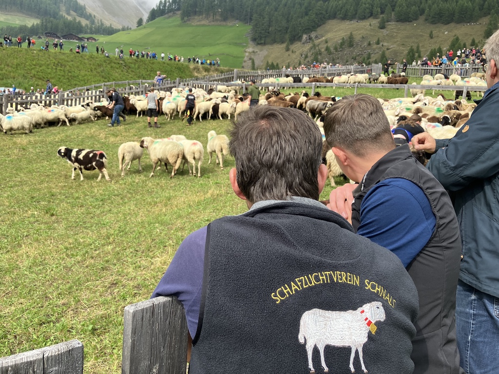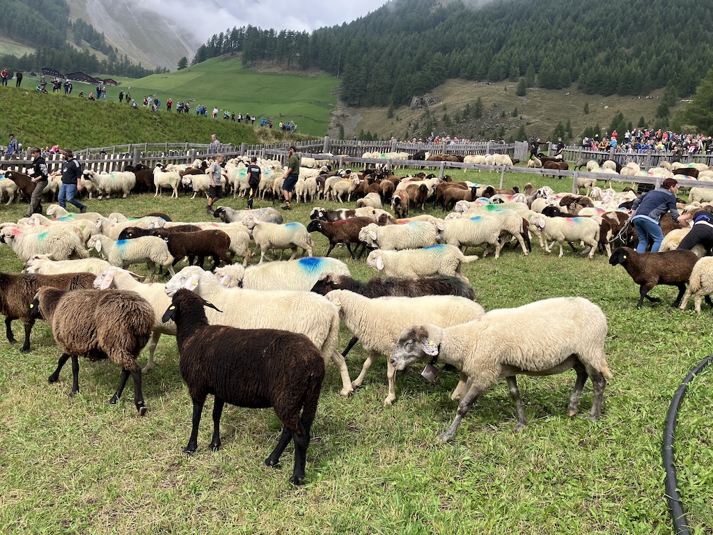 Ich begleite die Herde noch durch einen Lärchen- und Kiefernwald bis ins Tal, wo die Schafe von ihren Eigentümern in Empfang genommen werden. Durch ihre farbigen Markierungen auf dem zotteligen Fell findet jeder seine Tiere und leitet sie in die entsprechenden Koppeln, die von hunderten Schaulustigen umlagert sind.