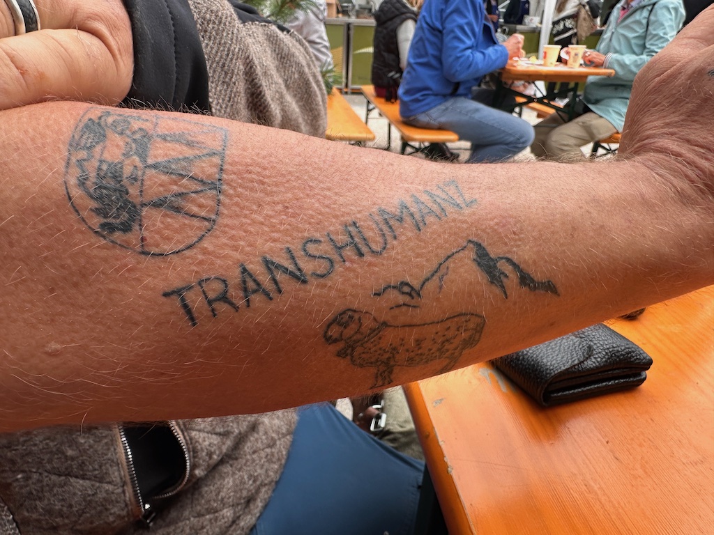 Hier treffe ich auch Heiko wieder, der oben am Berg gleich neben mir als Helfer die Hirten unterstützt hat. Der Hesse ist zum zweiten Mal dabei und derart begeistert, dass er sich die Transhumanz auf den Unterarm hat tätowieren lassen.