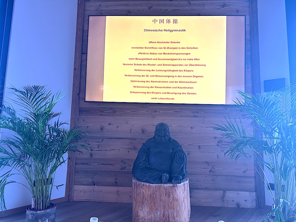Am nächsten Nachmittag stehe ich statt am Kuchenbuffet barfuß auf den Holzdielen des Panorama-Mediationsraums und folge den ruhigen Anweisungen von Stefan. Der gebürtige Hesse ist QiGong- und Shaolin-Trainer, und gibt seit 15 Jahren Kurse im Panorama Royal. Stefan ist einer jener Menschen, in deren Gegenwart man sich sofort ruhiger fühlt. Kein Zufall, wie ich vermute.