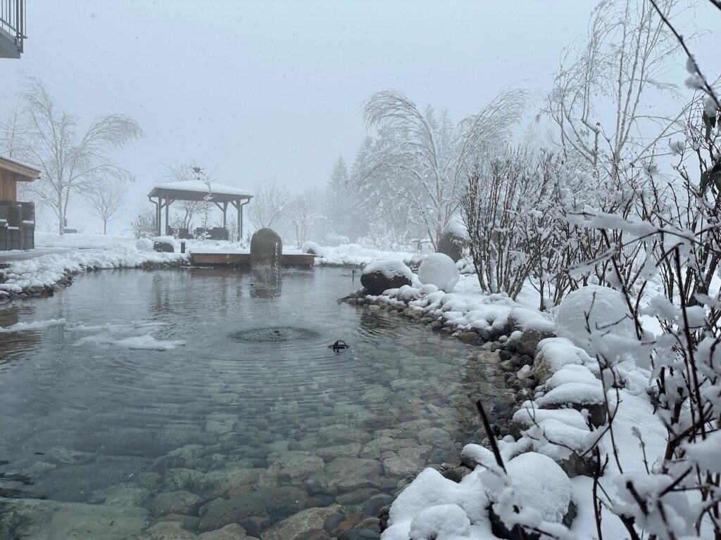 Eingebettet ist die gesamte Wellnesswelt in einen 20.000 Quadratmeter großen Panorama Park mit Naturteich, Ruheinseln, einem Energie-Steinkreis und einem Meditationsplatz. Ich setze mich in der winterlichen Mittagssonne eine halbe Stunde an den Naturteich, schaue auf die Tiroler Berge und den in der Sonne schimmernden Inn, höre einige Vögel singen – und tue nichts. Es ist herrlich.