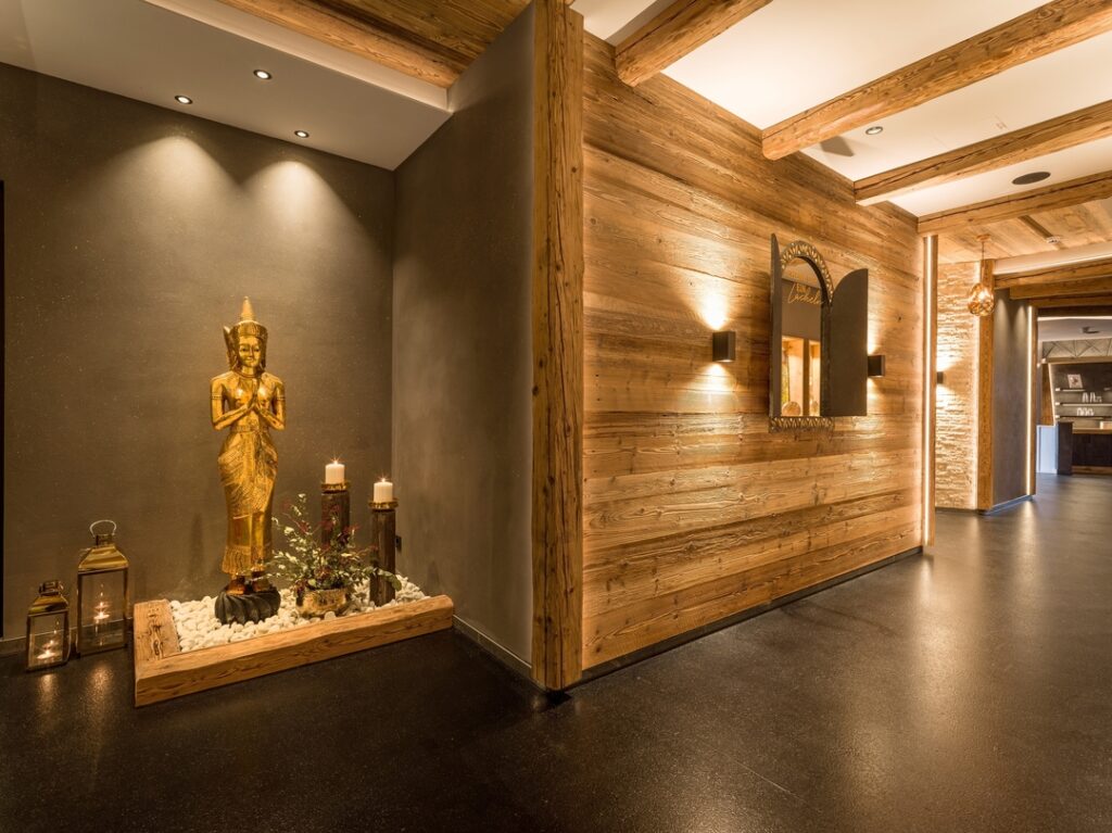 Laut Einordnung ist das Panorama Royal auch ein Wellness- und Spa-Hotel – und tatsächlich eines der beeindruckendsten, das ich je besucht habe. Auf zwei Etagen und 7.000 Quadratmetern erstreckt sich die „Relax Dream World“: eine vielfältige Saunalandschaft, eine Wasserwelt mit sieben Pools innen und außen, zahlreichen Ruhezonen mit und ohne Blick auf die Tiroler Berge, alles durchdacht aufgeteilt in einen Adults-Only-Bereich und ein Family-Spa. Und ansprechend dekoriert mit – Überraschung: zahlreichen vergoldeten Buddha-Figuren und buddhistischen Weisheiten. Die Anlage wurde nach einem Brand im Juni 2022 komplett neu errichtet – und man sieht, dass dabei jedes Detail mit Bedacht geplant wurde.
